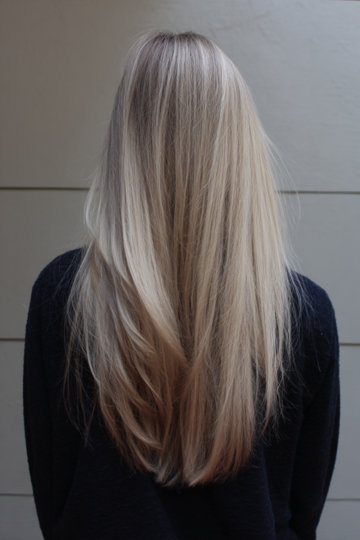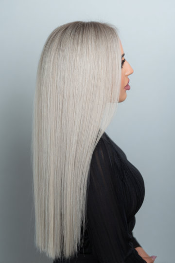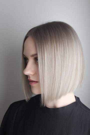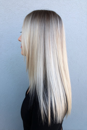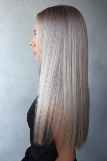 Straight hair in icy ash blonde is sleek. You can really see how silvery the color is when it’s this straight and shiny, no warm tones at all.