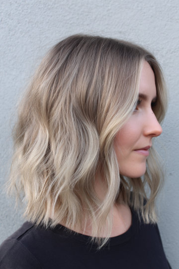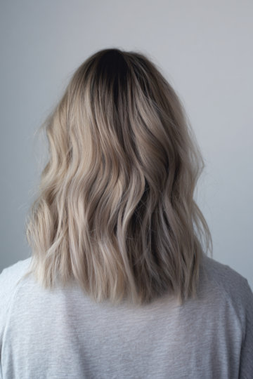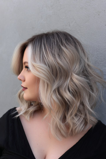Ash blonde wavy lob with natural roots are probably the easiest version to wear. Natural roots mean less upkeep, lob length works for everything, and waves make it look effortless.