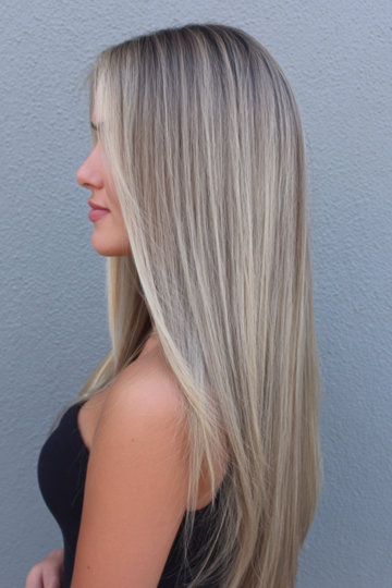 When ash blonde hair is this shiny and straight, it’s mesmerizing. Every highlight shows, and the cool tones reflecting light, like glass hair but ash blonde.