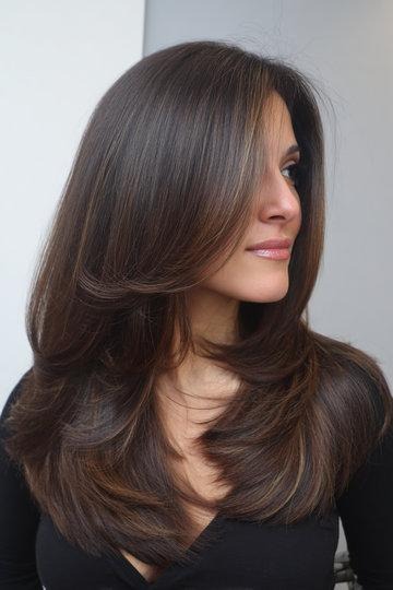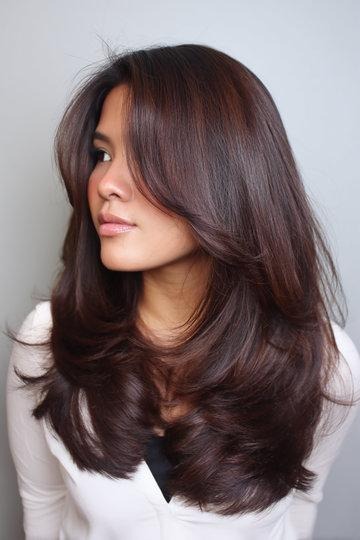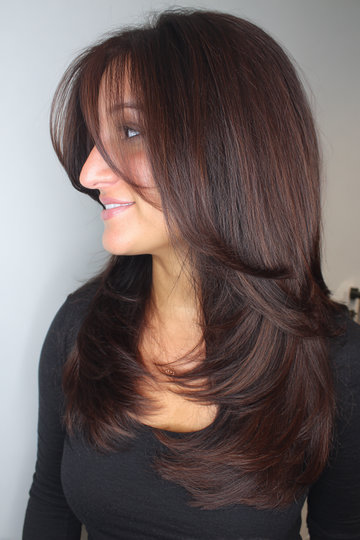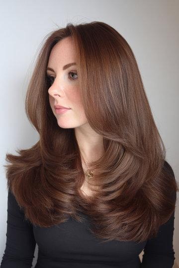 This is a super polished, almost glossy version of the butterfly cut — the layers are smooth and sleek rather than fluffy, which gives it more of a sophisticated, put-together feel. The dark chocolate brown color with a hint of reddish warmth adds richness and the side-swept layers frame the face in the most flattering way. If you want the butterfly cut but need it to look more corporate-friendly, this is your answer.