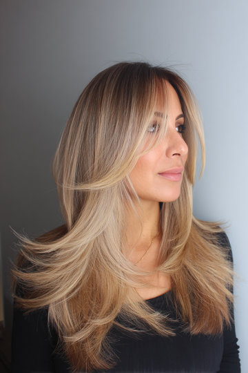 Sandy Blonde Butterfly Cut with Long Feathered Layers