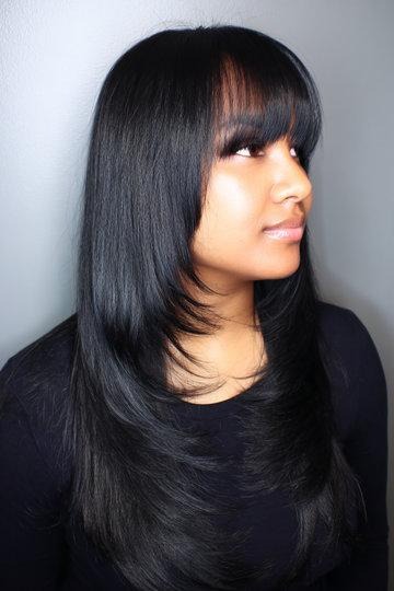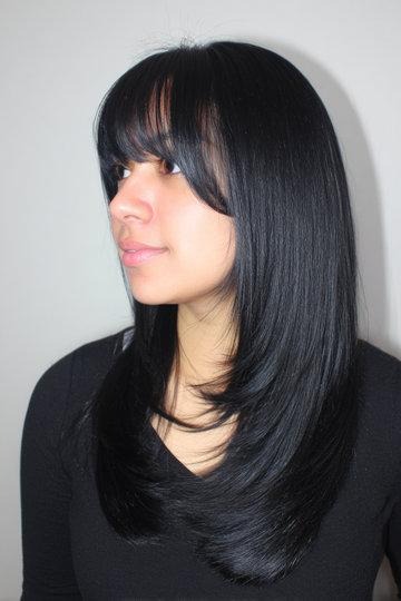 Jet Black Butterfly Cut with Straight Blunt Bangs and Sharp Layers