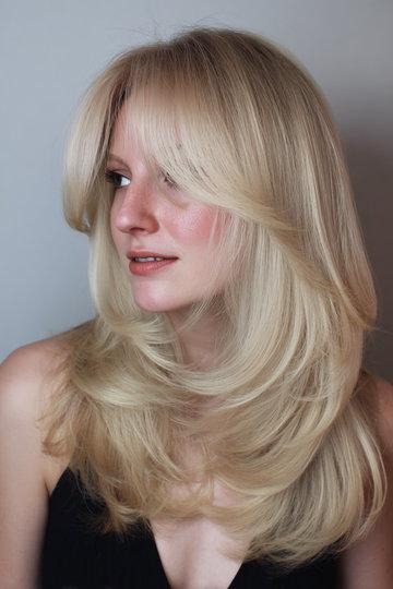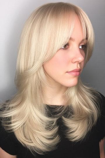 This is a slightly more structured take on the platinum blonde butterfly — the layers are more defined and the ends have a clear, intentional flip to them. There’s soft curtain bangs swept to the side which honestly ties the whole look together. It gives me major 70s vibes but in the best, most modern way possible.