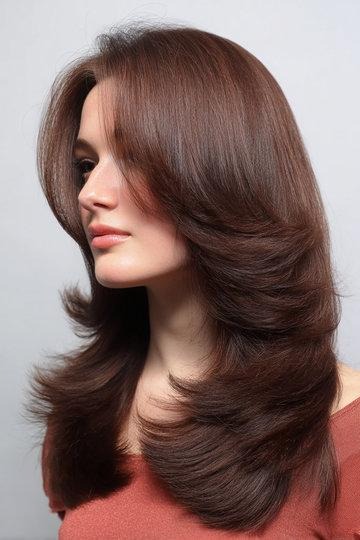 Rich Brunette Butterfly Cut with Voluminous Flipped Layers
