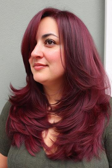 The color alone is a whole statement and then you add these big, fluffy butterfly layers on top of it and it’s just a lot of YES. The burgundy-wine color has this depth to it that makes the layers look incredibly dimensional as they fan out. This is the look for someone who wants to go bold with both color and cut at the same time — no half measures here.