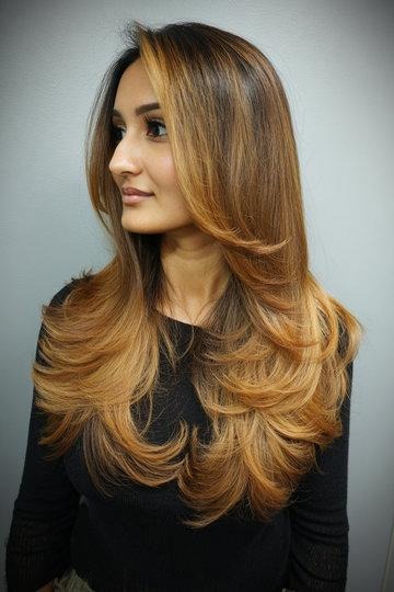 Warm Brown to Caramel Ombre Butterfly Cut with Sleek Layers