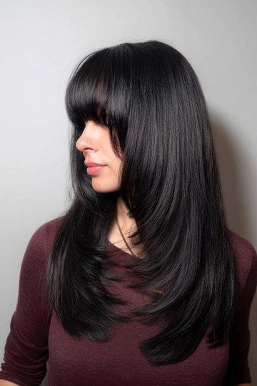 Jet Black Long Butterfly Cut with Side-Swept Layers
