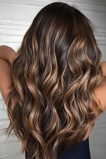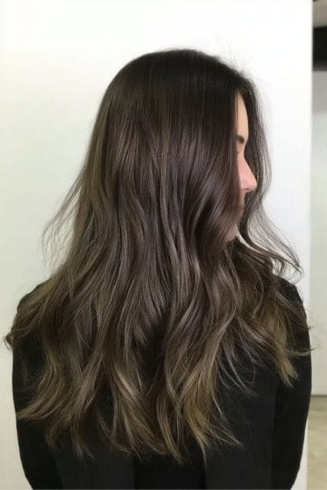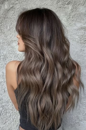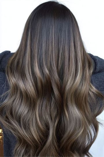 Ash brown balayage is for those who want a cool-toned, lived-in look. Ashy highlights are painted across the mid-length and ends, breaking up the darkness with silvery, smoky streaks. It’s chic, understated, and all about that “I just woke up like this” attitude. Super low-maintenance, but super high on style.