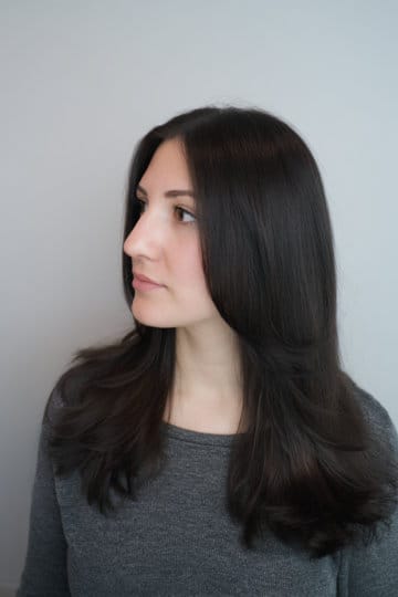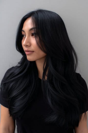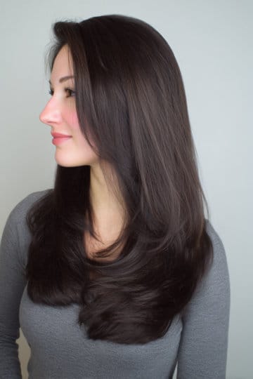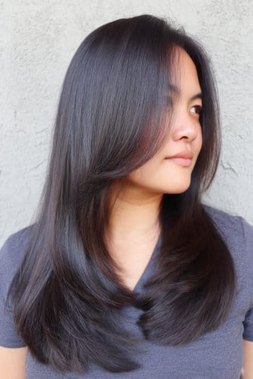 On this style, gentle layers is everything. They lighten up the thick hair and let the hair move, while the color is saturated but not flat like charcoal silk. Smoky black has a cool velvety finish that feels fancy. Sleek and simple and striking – so obsessed. It’s great for those with dark hair who want to take it to the next level, but the easy way.