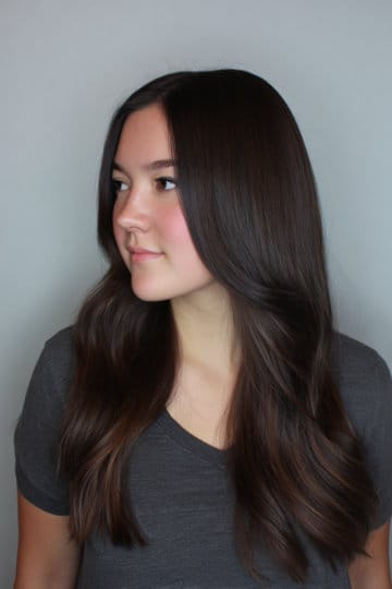If you want to change your long hair but only subtly – go for ‘invisible’ layers, that add air and movement but keep the bottom full looking. It’s secret structure for hair! The layers are still kept long so you get swing without the shagginess. Keeping this look close to the client’s natural dark brunette color for low-maintenancem then added gloss for shine, which is the main thing that makes it gleam.
