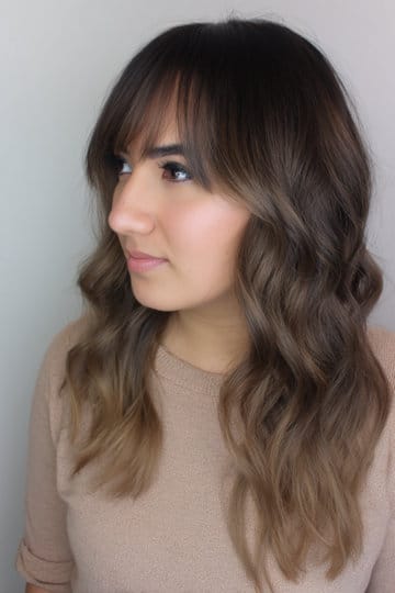 Mid-length layered cut with bottleneck bangs