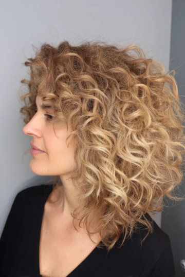 Curly hair needs layers bad. If you don’t layer it you get a triangle head. Nobody wants that! These tight curls get so bouncy with the right cut. Each curl does what it wants. They all look good together though. Honey blonde on top of that? Perfect.