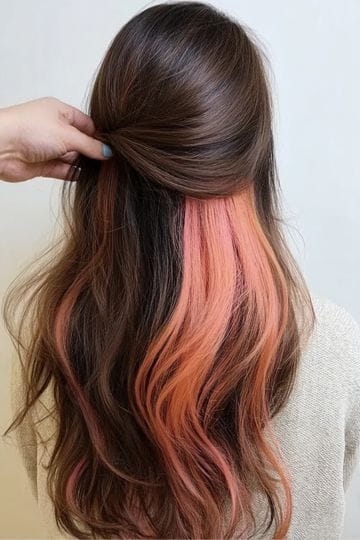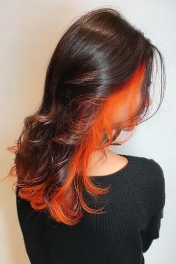 Sunset orange paints that golden hour glow right into your hair—no filter needed. Orange peekaboo strips are punchy and bold under brown or black, yet somehow soften when you let your waves drop over. The overall effect? Summer energy, even in the dead of winter. Perfect for those who hate blending in and have a thing for sun-drenched color.