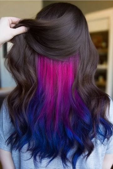 Magenta peekaboo is for risk-takers—full stop. This color sits comfortably between pink and purple and provides an electric burst beneath darker hair. It’s punchy, dramatic, and just the right amount of rebellious. Magenta says you know the rules. You just choose to rewrite them.