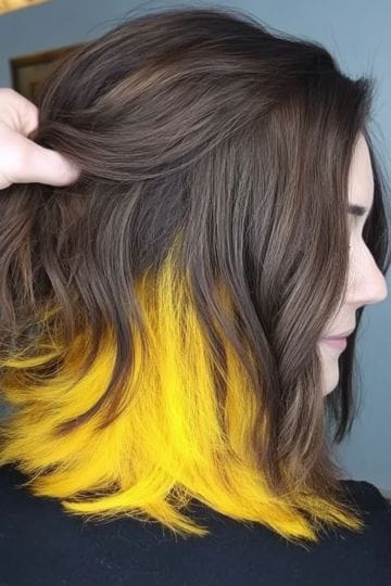 Golden yellow peekaboo underlayer is like a secret pocket of sunshine hiding under your hair. This shade adds cheer without overpowering your base—think subtle glints, sunlight-in-a-bottle, and all that jazz. Works gorgeously under caramel or chocolate brown. If you want to look like you just came back from a sunny vacation, this is it.