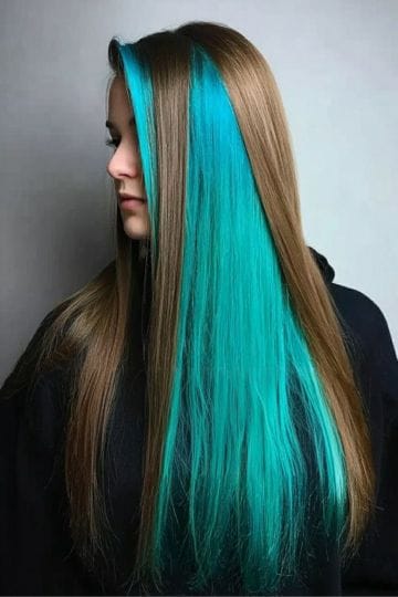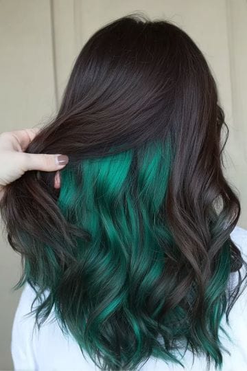 Emerald green: the color of envy, eco-chic, and those velvet couches everyone wanted in the last few years. Tucked under chocolatey or jet-black strands, emerald peekaboo hair smolders quietly, only coming alive in direct sunlight (or under a disco ball, if that’s your vibe). It’s high-fashion with a hint of forest fairy. Especially epic if you wear lots of gold jewelry—something about that green-gold combo just feels expensive.