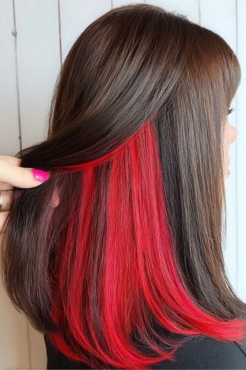 Fiery red peekaboo hair says, “Yeah, I am the main character.” Cinnamon, scarlet, or true fire-engine red—these shades ignite any base color. The contrast with black hair is bold and graphic while adding red under brunette warms things up, making your hair look like it’s on eternal golden hour. If you’re not ready for all-over color but want to make a power statement, this one’s a solid bet.