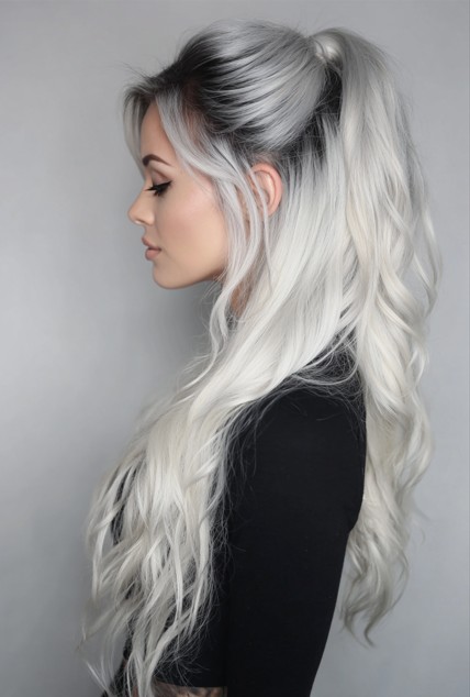 This is so sleek it looks fake in a good way. The dark root fades into this long silver white platinum that goes all the way to the waist with zero texture, just pure glassy smoothness. It is a really high maintenance color to get and keep but wow is it worth it. I would call this one the most editorial look in the whole list.